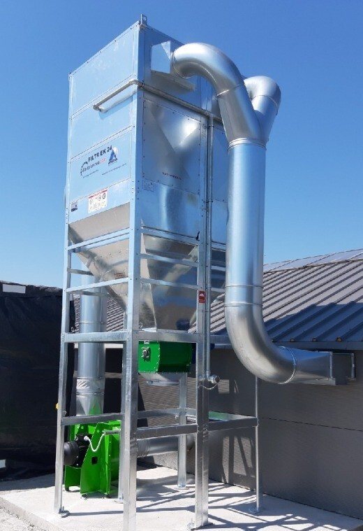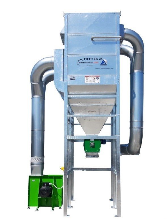 EK-24 wyposażony jest w elektrowibrator o mocy 0,09 kW w systemie ATEX służący do oczyszczania worków filtracyjnych wykonanych z materiału antyelektrostatycznego i wodoodpornego o gramaturze 350g/m² i przepuszczalności powietrza 240l/dm²/min. System oczyszczania jest w pełni zautomatyzowany i pracuje w odpowiednio dobranych cyklach czasowych dostosowanych do rodzaju odpylanego surowca.