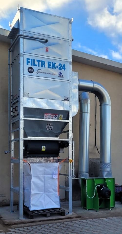 Filtr EK-24 pozwala na skuteczne odprowadzenie zanieczyszczeń z kilku urządzeń równocześnie co w dużym stopniu podnosi wydajność oraz komfort pracy. Idealnie sprawdza się przy współpracy z takimi urządzeniami jak: wyrówniarki, grubościówki, piły tarczowe i formatowe, piły panelowe, strugarki czterostronne, maszyny CNC, plotery frezujące czy szlifierki.